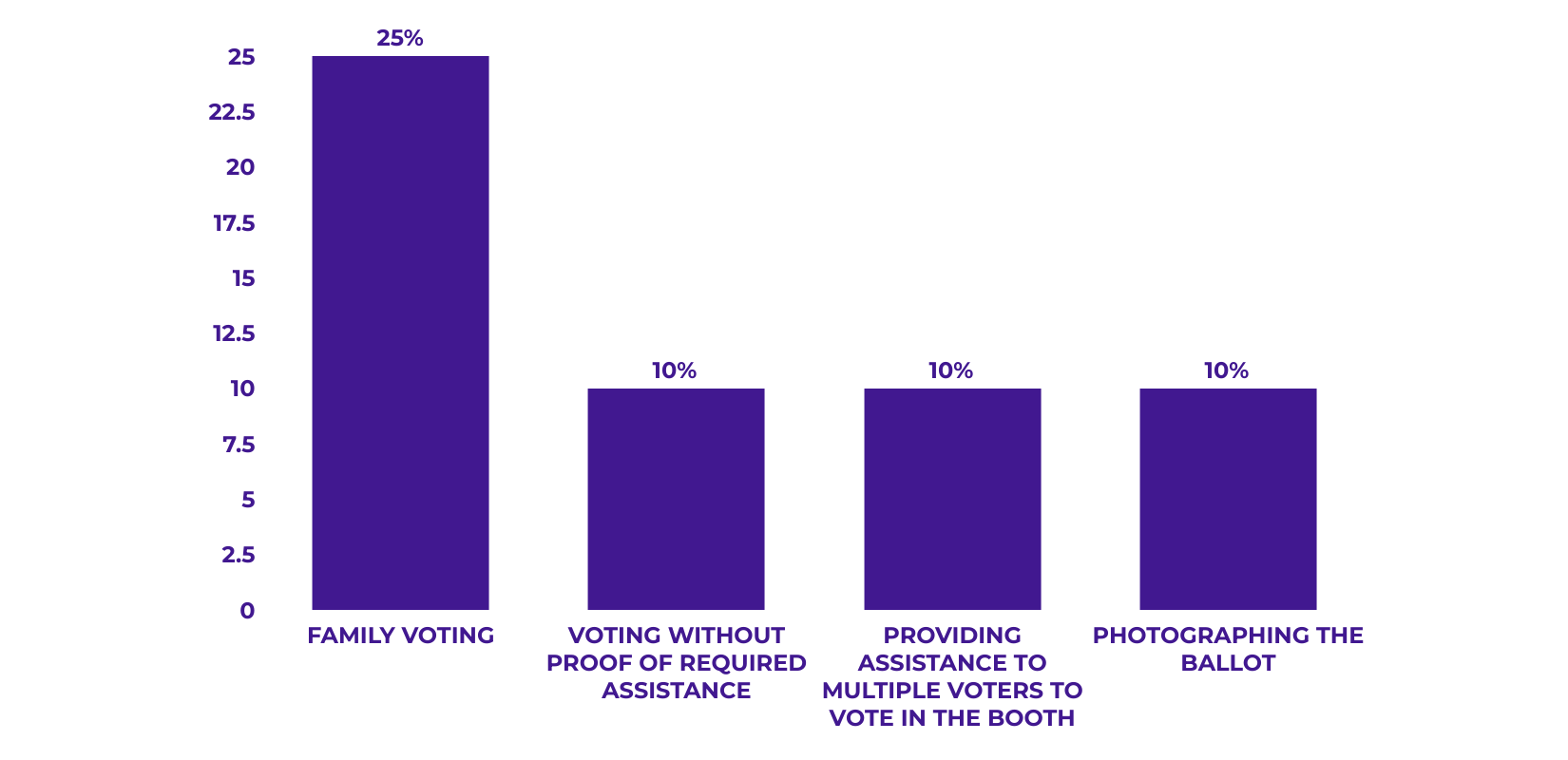 One person assisting multiple voters inside the voting booth – up to 10 cases (at 10% of polling stations / 2 polling stations)