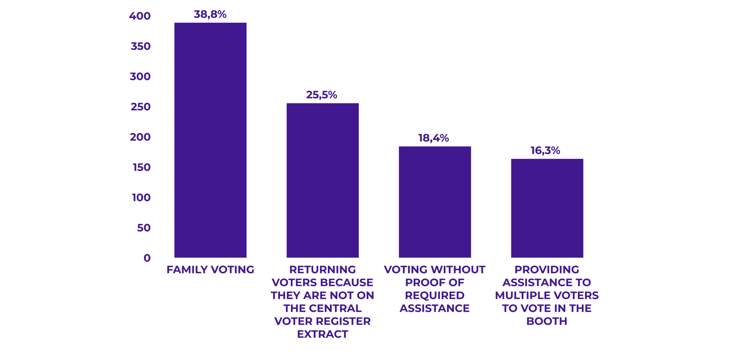 Electoral irregularities and procedural shortcomings that have traditionally recurred and were also recorded during the Repeat Early Elections include family voting, observed at 38.8% of polling stations, and the turning away of voters because they were not listed on the extract from the Central Voter Register at 25.5% of polling stations.